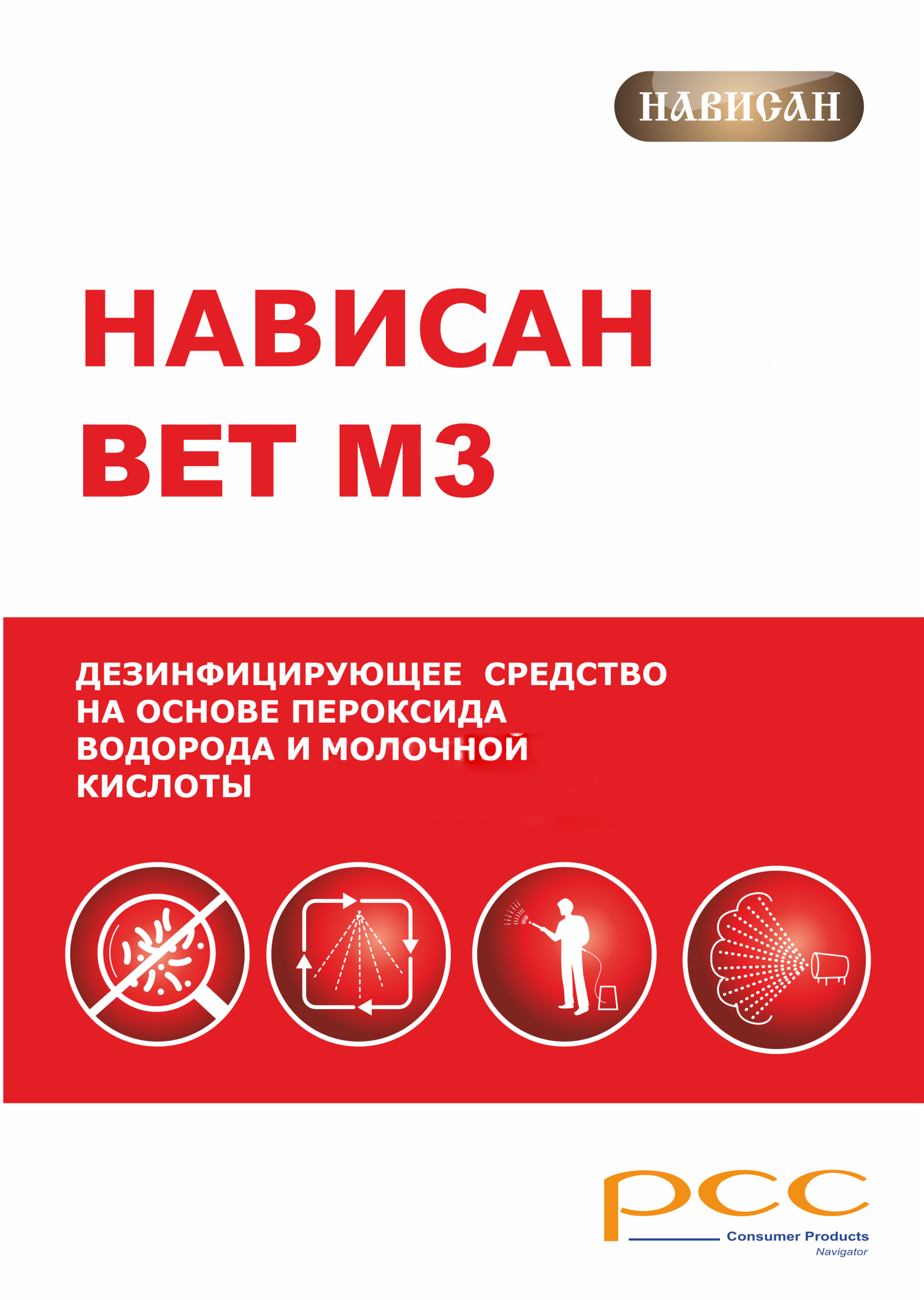 ОПИСАНИЕ Нависан ВЕТ М3 – это пенное дезинфицирующее средство для ветеринарного применения на животноводческих, птицеводческих, звероводческих помещений, а так же на других объектах агропромышленного и животноводческого комплекса ПРИМЕНЕНИЕ Средство предназначено для ручной, механизированной (пенной) одновременной мойки и дезинфекции технологического оборудования, помещений, вспомогательных объектов животноводства, мест скопления животных, автомобильного транспорта, используемого для перевозки животных, а так же спецодежды и инвентаря, используемого для ухода за животными. СОСТАВ Перекись водорода, четвертично-аммонийные соединения, молочная кислота, неионогенное поверхностно-активное вещество, стабилизирующий комплекс. СВОЙСТВА Обладает фунгицидным и бактерицидным действием Компоненты средства во внешней среде разлагаются с образованием нетоксичных продуктов Определяется методом титрования и кондуктометрически Содержит специальный комплексообразователь Дезинфицирующее действие в отношении возбудителей различных групп устойчивости к дез.средтвам ≤0,5-2,5% в течение 5-60 мин при температуре 20°C ЁМКОСТЬ 10л, 20л, 30л, 50л, 200л