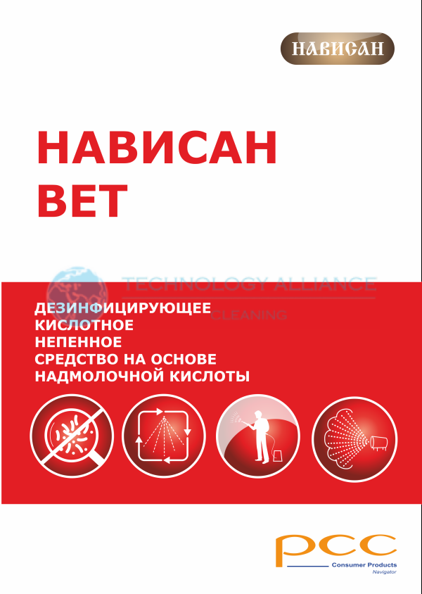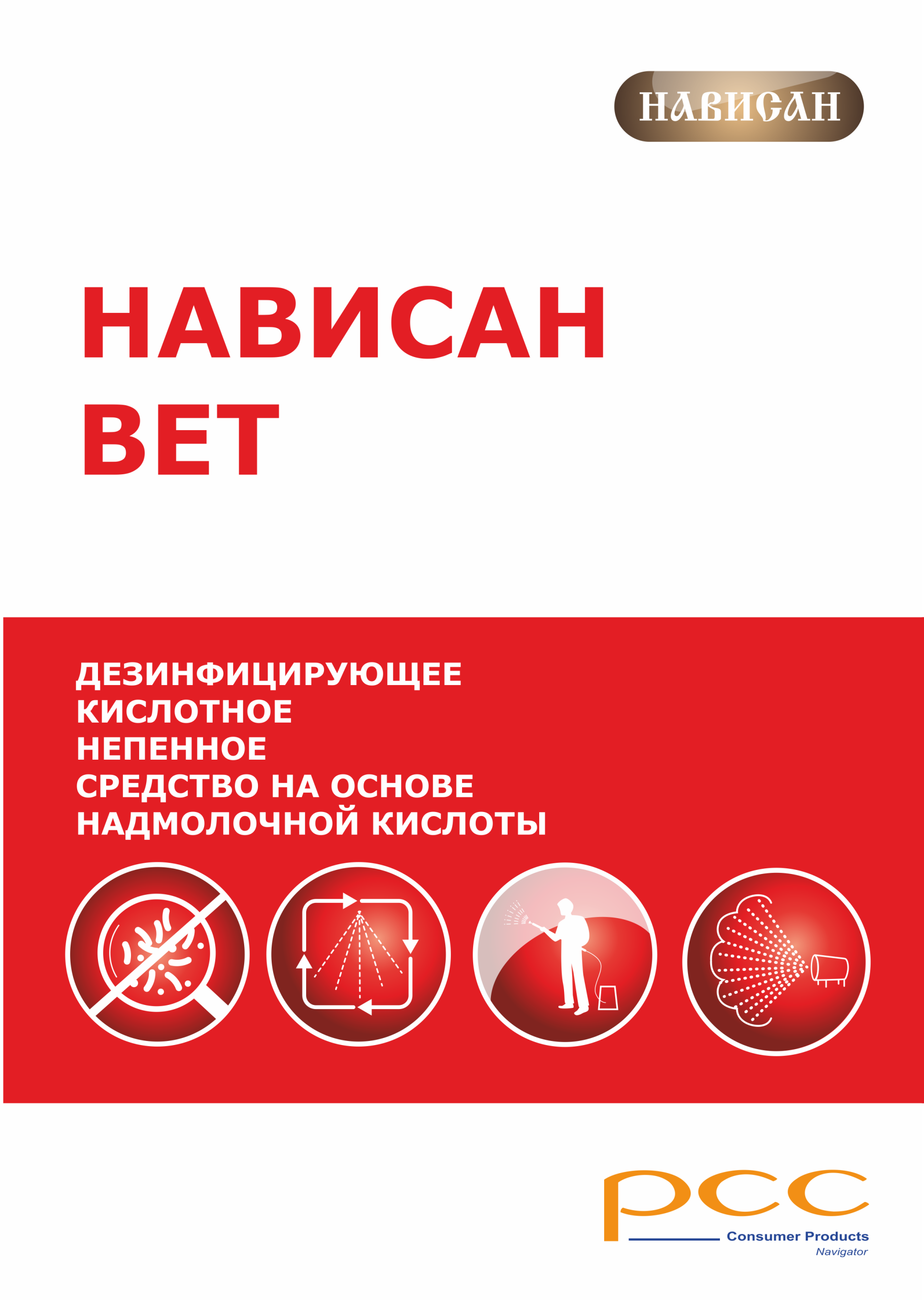 ОПИСАНИЕ Нависан ВЕТ – средство предназначено для дезинфекции животноводческих помещений по выращиванию и откорму молодняка крупного рогатого скота, автотранспорта, перевозящего скот, для дезинфекции различных поверхностей и воздуха помещений на объектах ветеринарии. Современный, экологичный, низкотоксичный дезинфектант с широким спектром антимикробного, противовирусного действия. Эффективен против вируса чумы свиней. Разработан совместно с Республиканским научно-исследовательским унитарным предприятием «Институт экспериментальной ветеринарии им. С.Н. Вышелевского» Национальной академии наук Беларуси; ПРИМЕНЕНИЕ Используется в виде рабочего раствора с концентрацией 0,3-3,0%. Подходит для дезинфекции замкнутых контуров и объемной дезинфекции СОСТАВ Перекись водорода, надмолочная кислота, ЧАС, стабилизирующий комплекс СВОЙСТВА Содержит активный кислород и надмолочную кислоту в качестве окислительного биоцида Обладает фунгицидным, бактерицидным и вирулицидным действием Экономичность в использовании ЕМКОСТЬ 10л, 20л, 200л, DPPL VO 1000л