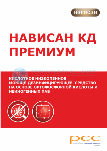 ОПИСАНИЕ Нависан КД Премиум – средство дезинфицирующее и моющее кислотное низкопенное на основе ортофосфорной кислоты для профессионального применения на предприятиях пищевой и непищевой отраслей промышленности, объектах агропромышленного и животноводческого комплексов ПРИМЕНЕНИЕ Средство предназначено для мойки замкнутых контуров (СИП-мойки) оборудования, контактирующего с пищевыми продуктами и продуктами для кормления животных внешних и внутренних поверхностей оборудования, промышленных емкостей. Средство предназначено для “туннельной” мойки сырных форм, внешних и внутренних поверхностей оборудования, промышленных емкостей. СОСТАВ Ортофосфорная кислота, поверхностно-активные вещества, модифицирующие поверхностный заряд форм, ингибиторы коррозии, дезинфектант СВОЙСТВА Эффективно в отношении органических загрязнений Определяется методом титрования и кондуктометрически Содержит ингибиторы коррозии Бактерицидное действие:≤0,5% в течение 5 минут при температуре 20°C Фунгицидное действие: ≤1,5%, 15 минут, 20°C ЕМКОСТЬ 10л, 20л, 200л, DPPL 1000л