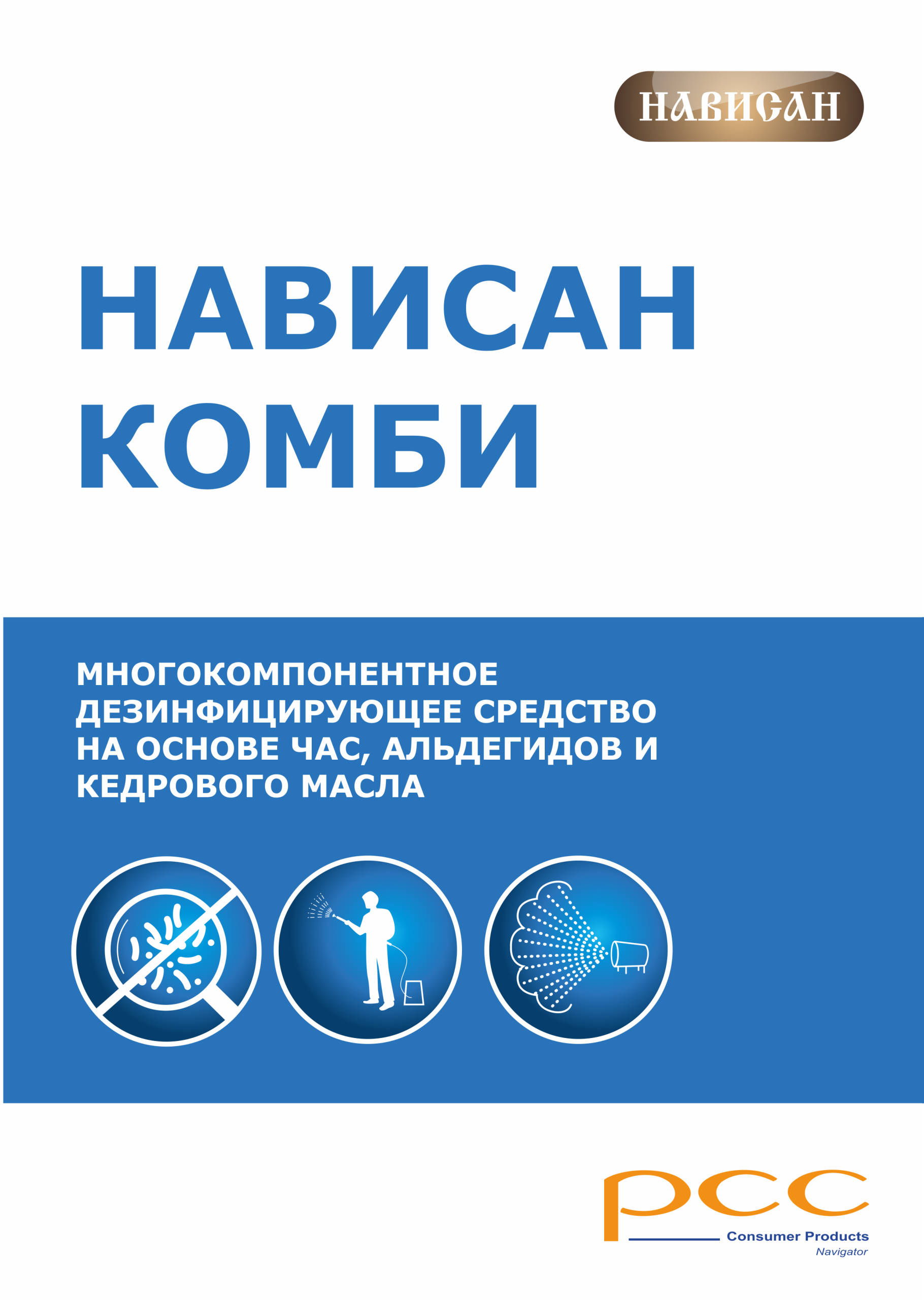 ОПИСАНИЕ Нависан Комби – средство дезинфицирующее предназначено для дезинфекции помещений, различных поверхностей, оборудования, стен, полов, инвентаря на предприятиях пищевых отраслей промышленности, для дезинфекции на предприятиях АПК, для дезинфекции автотранспорта, въезжающего на территорию через дезинфицирующие барьеры. Препарат применяется для дезинфекции обуви персонала и посетителей, для объемной дезинфекции воздуха помещений, для дезинфекции отходов пищевой и перерабатывающей промышленности ПРИМЕНЕНИЕ Используется в виде рабочего раствора с концентрацией 1,0-2,0%. Подходит для дезинфекции замкнутых контуров и объемной дезинфекции СОСТАВ ЧАС, альдегиды, смесь ПАВ, органический растворитель, кедровое масло СВОЙСТВА В качестве биоцида содержит смесь ЧАС и альдегиды Обладает фунгицидным, бактерицидным и вирулицидным действием Экономичность в использовании Химически нейтральное ЕМКОСТЬ 10л, 20л, 200л, DPPL 1000л