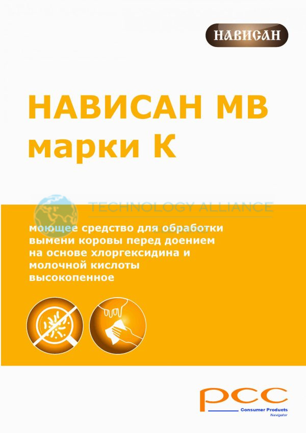 ОПИСАНИЕ Нависан МВ К – высокопенное средство для преддоильной обработки вымени коровы с целью удаления загрязнений с поверхностей кожи, основания вымени и сосков контактирующих в дальнейшем в процессе доения коров с сосковой резиной ПРИМЕНЕНИЕ Рабочая концентрация средства – 1%. Наносить с помощью специального пенообразующего стакана. СОСТАВ Биологическая молочная кислота, хлоргексидина биглюконат, смесь ПАВ, глицерин, ланолин СВОЙСТВА В качестве биоцидов содержит молочную кислоту и хлоргексидина биглюконат Увлажняет кожу, предотвращая раздражение во время доения Экономично в использовании Высокое пенообразование Эффективно удаляет загрязнения ЕМКОСТЬ 10л, 20л, 200л, DPPL 1000л